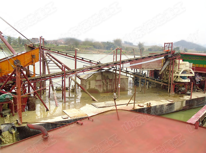 而石子很多,直径又比较大的河道就要用滚筒式的筛子了。经过筛分后的石子一般直接流入河道,如果有经济价值也可由传送带输送到岸上出售;河沙转入磁选系统。磁选系统主要是磁选机和水洗精选系统。磁选机的磁表强度一般要达到3800-4500高斯,规格为750*2200-2400,这样配套才能达到90%的净选率。水洗的作用是提高毛铁粉的品位,一般可在30-45之间自由调节。尾沙排除系统的作用是将选去铁粉的尾沙排到远离本机械的地方,以保证本机械能正常的工作。一般有自流式、传送带式、抽沙泵式三种形式当然这也是根据河道的具体环境来定的。