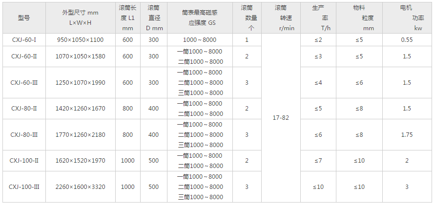 CXJ型筒式榴莲网站在线观看(从单筒到三筒)是一种从干性粉料中连续自动除铁的磁选设备其内部采用独特的磁路设计,由高性能永磁王钕铁硼材料作为磁源,磁场强、吸力大、除铁率高,入料方式采用我公司匀速振动给料装置,入料均匀,更利于进入磁选区后的分离。具有免维护、节约能源、使用可靠等特点,可调整控制进料量,适用于不同颗粒的要求。